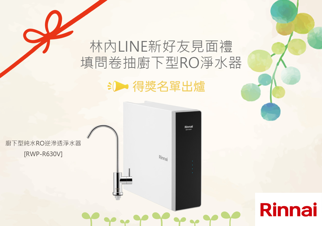 「廚下型純水RO逆滲透淨水器 RWP-R630V」得獎名單公布如下