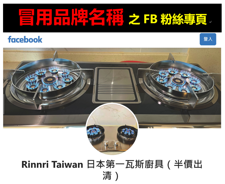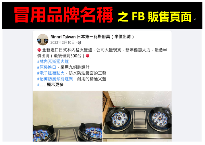 近期,本公司發現網路上有疑似侵害「林內」中英文商標之不明人士,於臉書等社群軟體上兜售來路不明,非屬本公司產製之瓦斯爐等產品而意圖混淆消費者。為維護廣大消費者權益,以及本公司暨「林內」品牌之信譽,特此聲明如下: